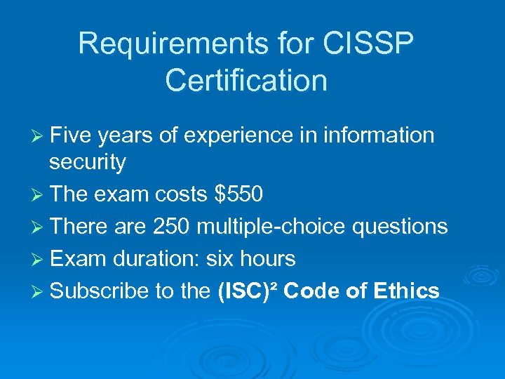 Requirements for CISSP Certification Ø Five years of experience in information security Ø The exam costs $550 Ø There are 250 multiple-choice questions Ø Exam duration: six hours Ø Subscribe to the (ISC)² Code of Ethics
