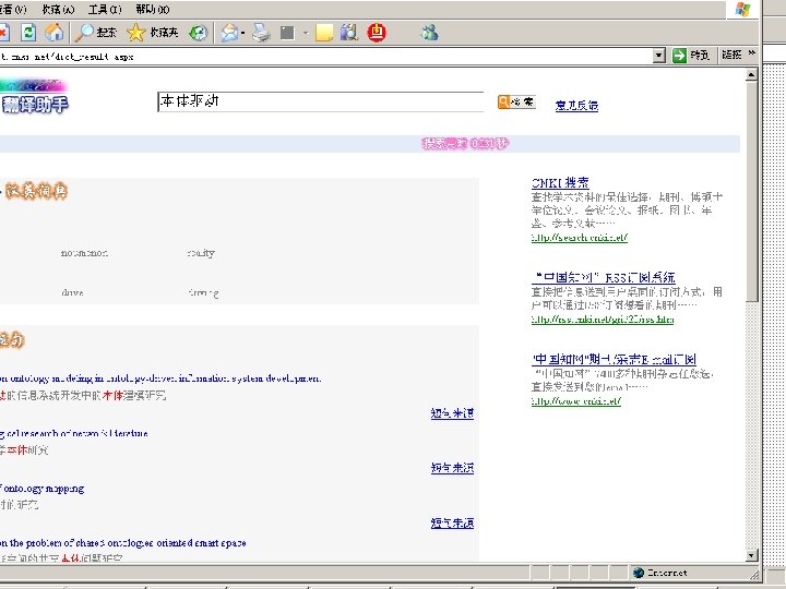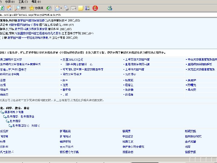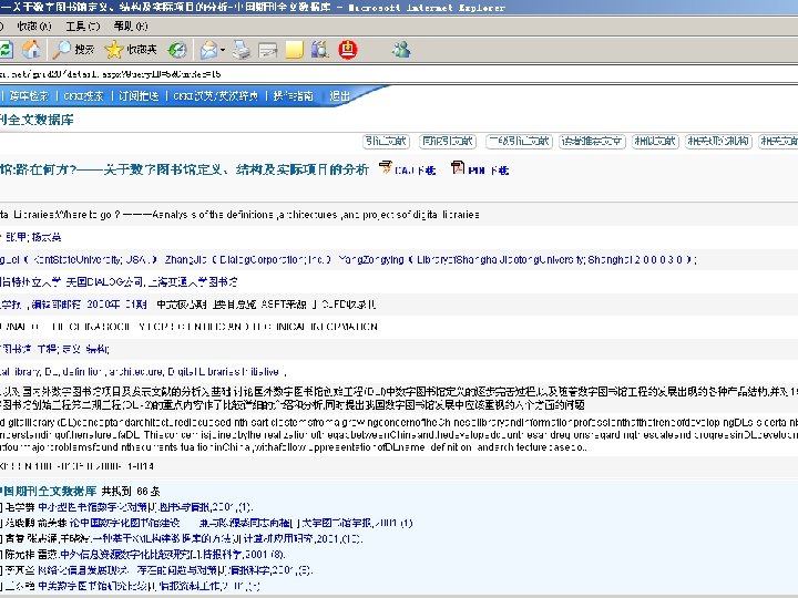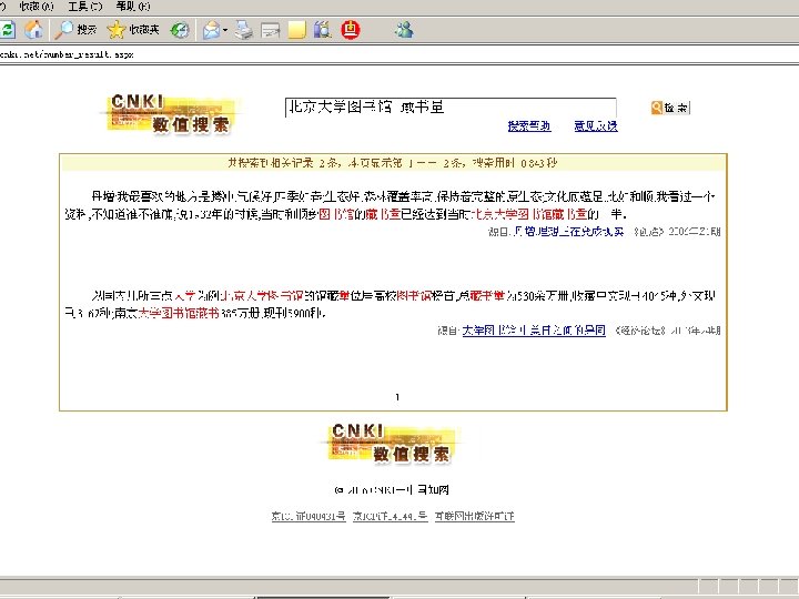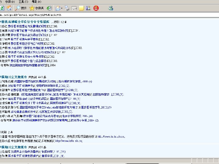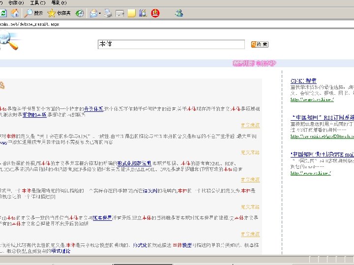 相关技术 • • • 概念关系词典 相似文献分析技术 全文句法检索 网格共享技术 学术搜索引擎技术 知网节出版技术 统一导航统一检索技术 引文链接识别分析技术 蚁群挖掘技术