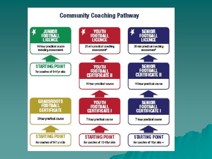 Coaching Courses in 2010 FFA now recommends that: u Head Coaches at association clubs run Grassroots u Regional Directors of Coaching teach Head Coaches in-turn to ‘present’ at Grassroots level u Now part of Head coaches role/expectations at club level u Other courses run by instructors (Junior/Youth/Senior)