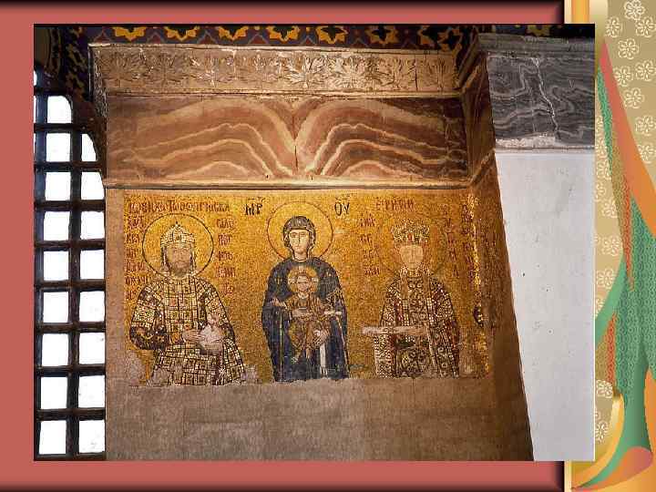 Мозаика собора. Византийское мозаичное искусство к середине I тыс. н. э. достигло высочайшего уровня, поэтому уже к моменту открытия Софии как действующего храма, ее стены почти полностью были покрыты прекрасной мозаикой. С воцарением на императорский трон Византии правителей македонской династии в искусстве Империи начался новый подъем (позже он будет назван «македонским ренессансом» ). Наиболее полное представление о первоначальных мозаиках Софии (доиконоборческого периода) дает первый мозаичный цикл, созданный в храме к 867 г. примерно в той же технике и манере исполнения, что и ранние изображения. К этому циклу относятся мозаики центральной апсиды, главным из которых является тронное изображение Богоматери, держащей перед собой на коленях своего Сына. Искусствоведы-византологи высоко оценивают данную икону, отмечая, что «… этот изумительный образ представляет одно из высших воплощений византийского гения» . По обе стороны от фигуры Богоматери изображены 2 архангела (сохранилось только изображение архангела Гавриила). Выше этих икон, на конхе апсиды, была сделана надпись: «Изображения, которые обманщики здесь низвергли, благочестивые правители восстановили» .