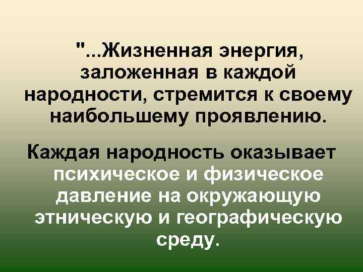 ". . . Жизненная энергия, заложенная в каждой народности, стремится к своему наибольшему проявлению. Каждая народность оказывает психическое и физическое давление на окружающую этническую и географическую среду.