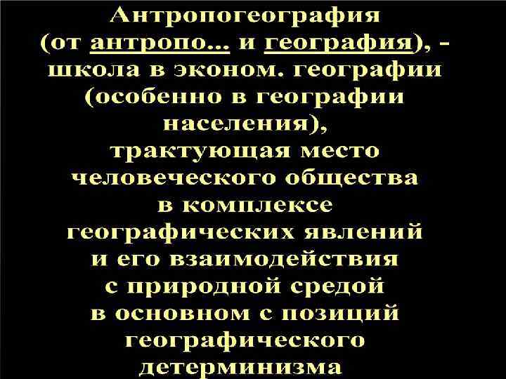 Антропогеография была разработана немецким географом, этнографом и социологом Ф. Ратцелем, который вскрыл сложность связей человека с окружающей средой, но вместе с тем объявил задачей Антропогеографии «выяснение влияния природы на дух и тело индивидов и народов» и выводил переход от низших стадий хозяйственного развития к высшим лишь из возрастания плотности населения. Впоследствии идеи Антропогеографии были широко использованы геополитикой