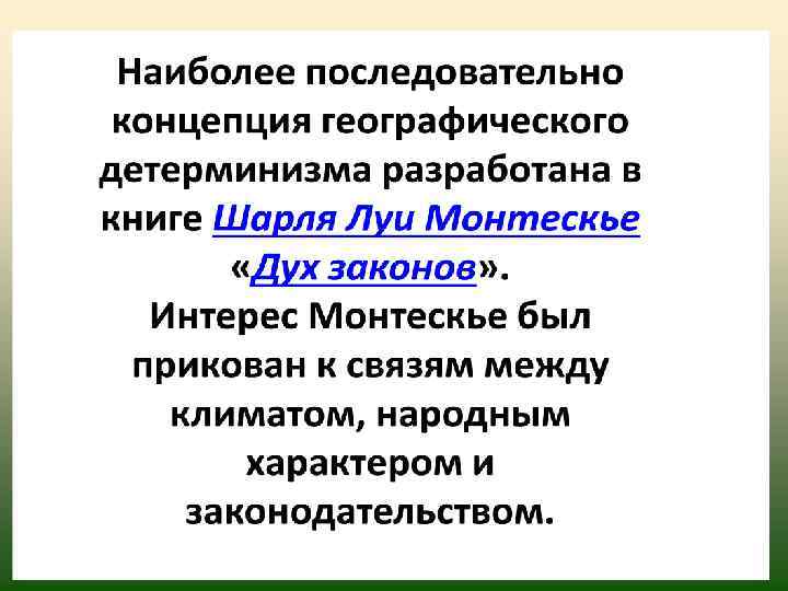Т. О. , в своих попытках объяснения общественных явлений антропогеографы стремились вывести «дух законов общественного развития» из природных условий, в частности из климата.