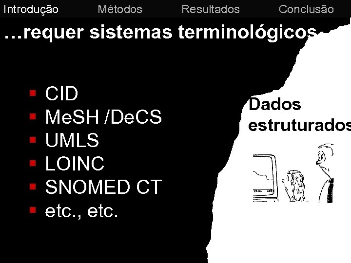 Introdução Métodos Resultados Conclusão …requer sistemas terminológicos § § § CID Me. SH /De. CS UMLS LOINC SNOMED CT etc. , etc. Dados estruturados