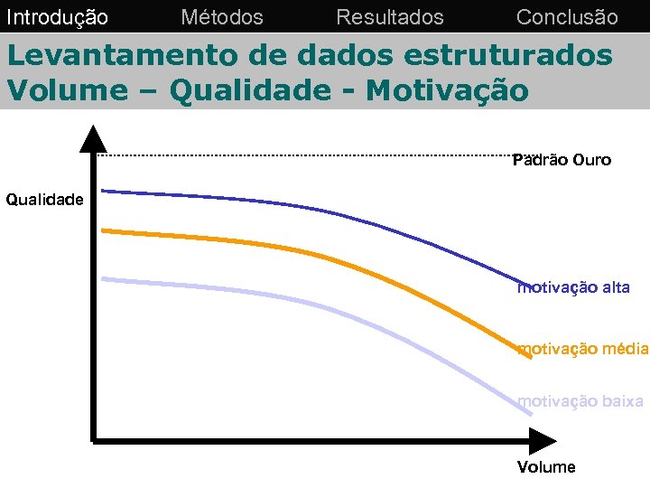 Introdução Métodos Resultados Conclusão Levantamento de dados estruturados Volume – Qualidade - Motivação Padrão Ouro Qualidade motivação alta motivação média motivação baixa Volume