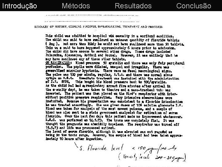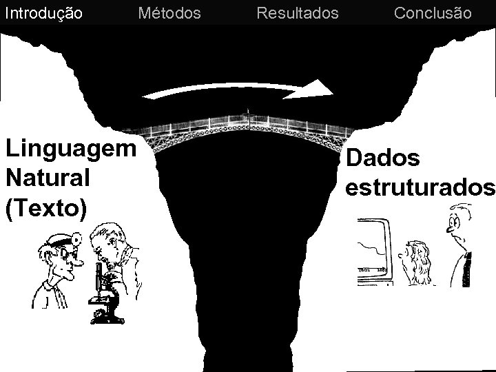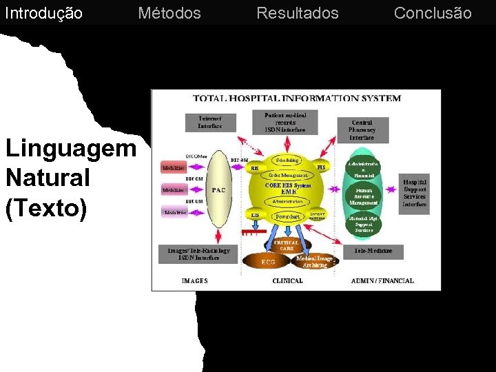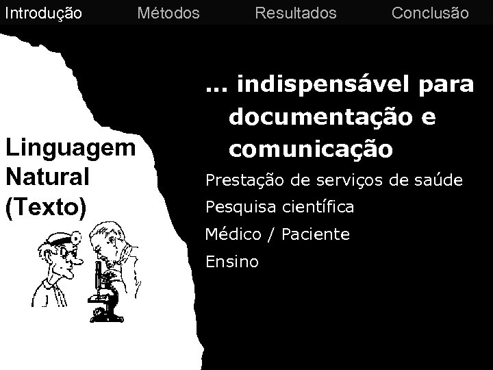 Introdução Linguagem Natural (Texto) Métodos Resultados Conclusão … indispensável para documentação e Structured comunicação Data Prestação de serviços de saúde Pesquisa científica Médico / Paciente Ensino