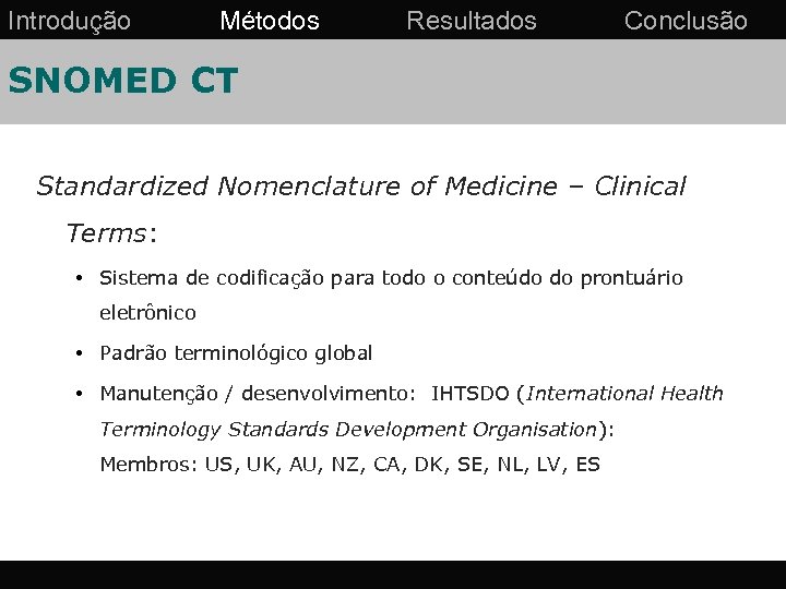 Introdução Métodos Resultados Conclusão SNOMED CT Standardized Nomenclature of Medicine – Clinical Terms: • Sistema de codificação para todo o conteúdo do prontuário eletrônico • Padrão terminológico global • Manutenção / desenvolvimento: IHTSDO (International Health Terminology Standards Development Organisation): Membros: US, UK, AU, NZ, CA, DK, SE, NL, LV, ES