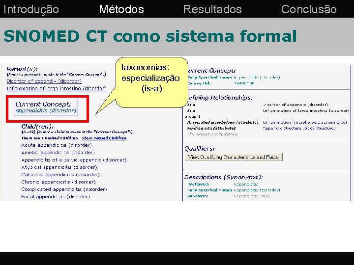 Introdução Métodos Resultados Conclusão SNOMED CT como sistema formal taxonomias: especialização (is-a)