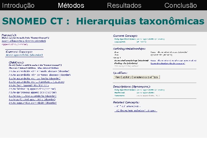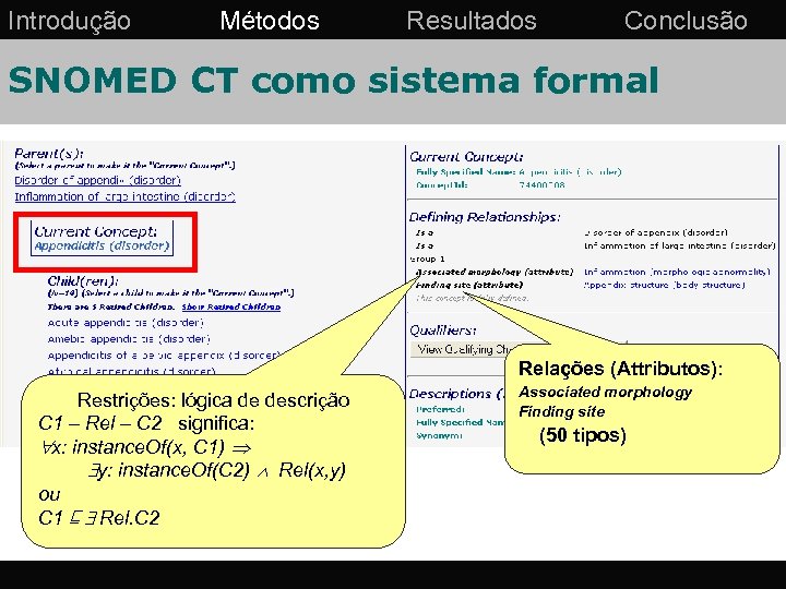 Introdução Métodos Resultados Conclusão SNOMED CT como sistema formal Relações (Attributos): Restrições: lógica de descrição C 1 – Rel – C 2 significa: x: instance. Of(x, C 1) y: instance. Of(C 2) Rel(x, y) ou C 1 ⊑ Rel. C 2 Associated morphology Finding site (50 tipos)