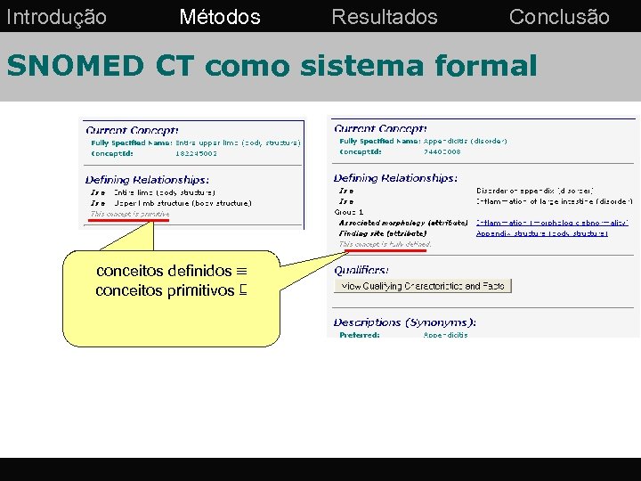 Introdução Métodos Resultados Conclusão SNOMED CT como sistema formal definierte vs. primitive conceitos definidos Konzepte conceitos primitivos ⊑