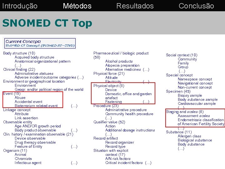 Introdução Métodos Resultados Conclusão SNOMED CT Top Body structure (10) Acquired body structure Anatomical organizational pattern (…) Clinical finding (22) Administrative statuses Adverse incident outcome categories (…) Environment or geographical location Environment Geogr. and/or political region of the world Event (19) Abuse Accidental event Bioterrorism related event (…) Linkage concept Attribute Link assertion Observable entity Age AND/OR growth period Body product observable (…) Clin. history / examination observable (21) Device observable Drug therapy observable Feature of Entity (…) Organism (11) Animal Chromista Infectious agent (…) Pharmaceutical / biologic product (58) Alcohol products Alopecia preparation Alternative medicines (…) Physical force (21) Altitude Electricity (…) Physical object (8) Device Domestic, office and garden artefact Fastening (…) Procedure (23) Administrative procedure Community health procedure (…) Qualifier value (52) Action Additional dosage instructions (…) Record artifact Record organizer Record type Situation with explicit context (17) A/N risk factors Critical incident factors (…) Social context (10) Community Family Group (…) Special concept Namespace concept Navigational concept Non-current concept Specimen (45) Biopsy sample Body substance sample Cardiovascular sample (…) Staging and scales (6) Assessment scales Endometriosis classification of American Fertility Society (…) Substance (11) Allergen class Biological substance Body substance (…)