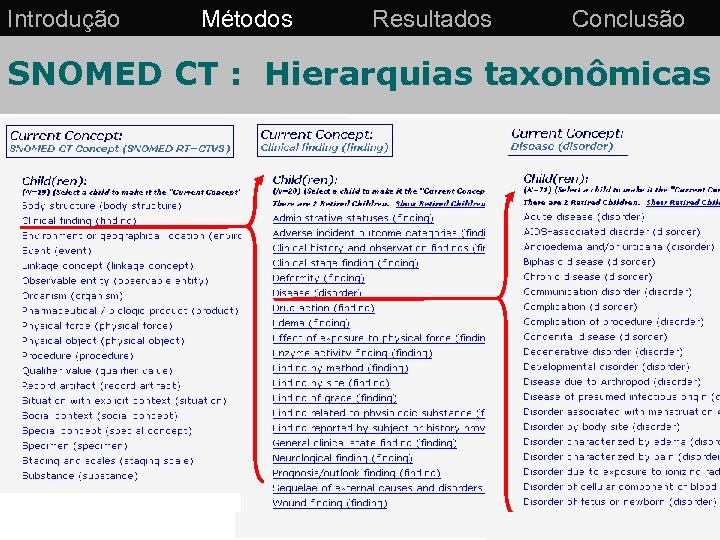 Introdução Métodos Resultados Conclusão SNOMED CT : Hierarquias taxonômicas