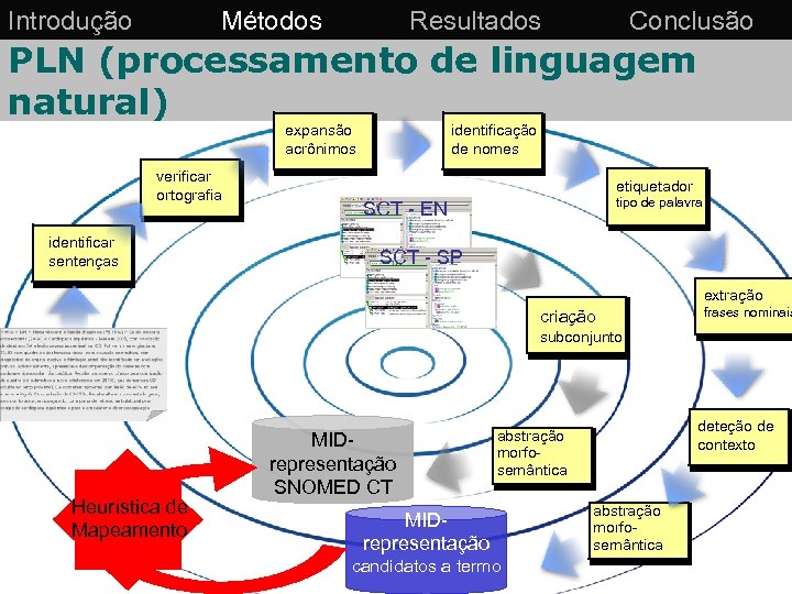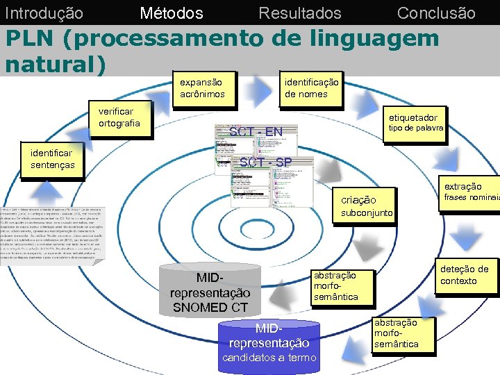 Introdução Métodos Resultados Conclusão PLN (processamento de linguagem natural) expansão acrônimos verificar ortografia identificar sentenças identificação de nomes etiquetador tipo de palavra SCT - EN SCT - SP extração criação frases nominais subconjunto MIDrepresentação SNOMED CT deteção de contexto abstração morfosemântica MIDrepresentação candidatos a termo abstração morfosemântica