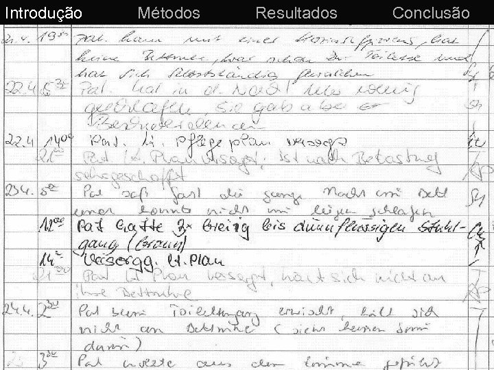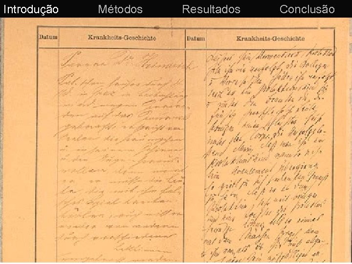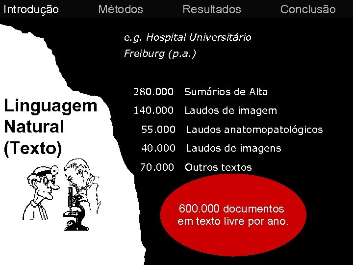 Introdução Métodos Resultados Conclusão e. g. Hospital Universitário Freiburg (p. a. ) Linguagem Natural (Texto) 280. 000 Sumários de Alta 140. 000 Laudos de imagem 55. 000 Laudos anatomopatológicos 40. 000 Laudos de imagens 70. 000 Outros textos 600. 000 documentos em texto livre por ano.
