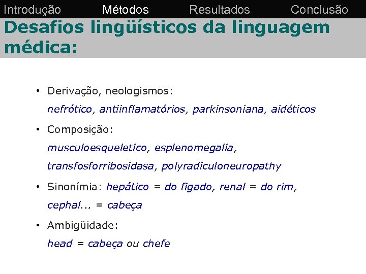 Introdução Métodos Resultados Conclusão Desafios lingüísticos da linguagem médica: • Derivação, neologismos: nefrótico, antiinflamatórios, parkinsoniana, aidéticos • Composição: musculoesqueletico, esplenomegalia, transfosforribosidasa, polyradiculoneuropathy • Sinonímia: hepático = do figado, renal = do rim, cephal. . . = cabeça • Ambigüidade: head = cabeça ou chefe