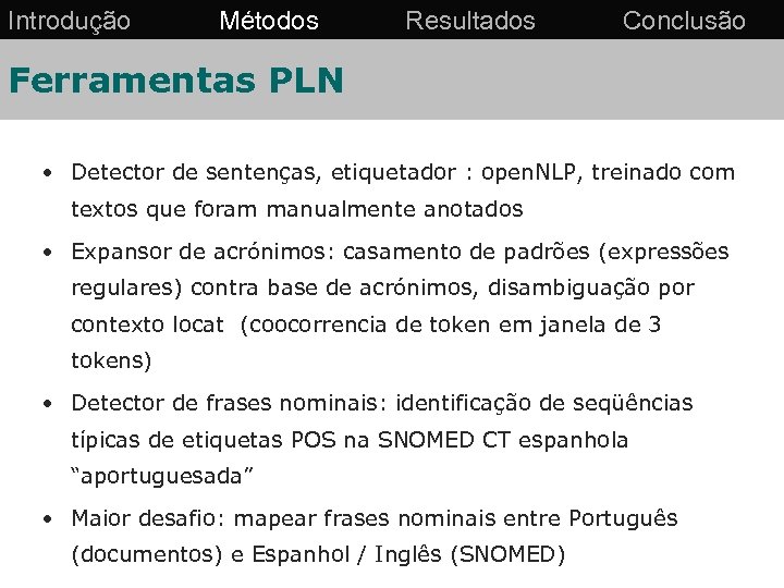Introdução Métodos Resultados Conclusão Ferramentas PLN • Detector de sentenças, etiquetador : open. NLP, treinado com textos que foram manualmente anotados • Expansor de acrónimos: casamento de padrões (expressões regulares) contra base de acrónimos, disambiguação por contexto locat (coocorrencia de token em janela de 3 tokens) • Detector de frases nominais: identificação de seqüências típicas de etiquetas POS na SNOMED CT espanhola “aportuguesada” • Maior desafio: mapear frases nominais entre Português (documentos) e Espanhol / Inglês (SNOMED)