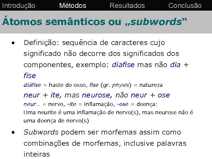 Introdução Métodos Resultados Conclusão Átomos semânticos ou „subwords“ • Definição: sequência de caracteres cujo significado não decorre dos significados componentes, exemplo: diafise mas não dia + fise diáfise = haste do osso, fise (gr. physis) = natureza neur + ite, mas neurose, não neur + ose neur… = nervo, -ite = inflamação, -ose = doença: Uma neurite é uma inflamação de nervo(s), mas neurose não é uma doença de nervo(s) • Subwords podem ser morfemas assim como combinações de morfemas, inclusive palavras inteiras