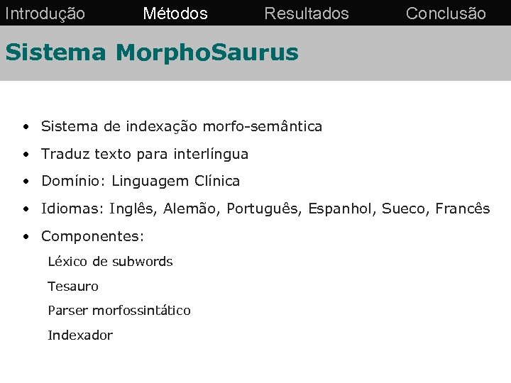 Introdução Métodos Resultados Conclusão Sistema Morpho. Saurus • Sistema de indexação morfo-semântica • Traduz texto para interlíngua • Domínio: Linguagem Clínica • Idiomas: Inglês, Alemão, Português, Espanhol, Sueco, Francês • Componentes: Léxico de subwords Tesauro Parser morfossintático Indexador