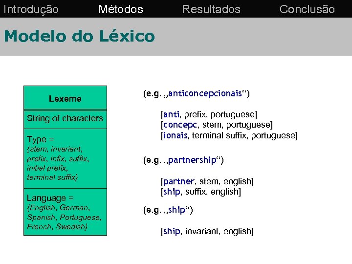 Introdução Métodos Resultados Conclusão Modelo do Léxico Lexeme String of characters Type = {stem, invariant, prefix, infix, suffix, initial prefix, terminal suffix} Language = {English, German, Spanish, Portuguese, French, Swedish} (e. g. „anticoncepcionais“) [anti, prefix, portuguese] [concepc, stem, portuguese] [ionais, terminal suffix, portuguese] (e. g. „partnership“) [partner, stem, english] [ship, suffix, english] (e. g. „ship“) [ship, invariant, english]