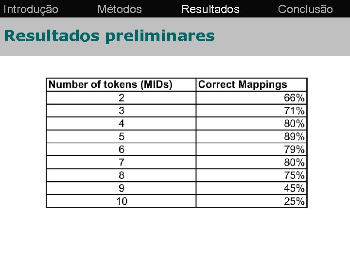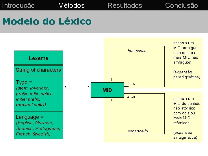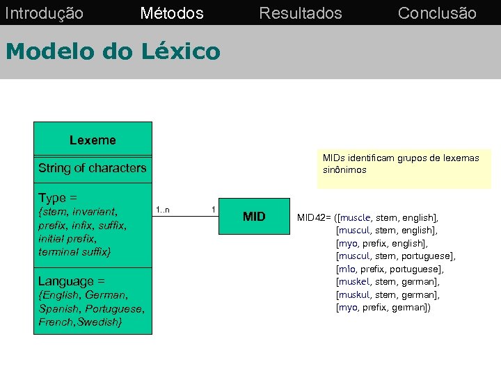 Introdução Métodos Resultados Conclusão Modelo do Léxico Lexeme MIDs identificam grupos de lexemas sinônimos String of characters Type = {stem, invariant, prefix, infix, suffix, initial prefix, terminal suffix} Language = {English, German, Spanish, Portuguese, French, Swedish} 1. . n 1 MID 42= ([muscle, stem, english], [muscul, stem, english], [myo, prefix, english], [muscul, stem, portuguese], [mio, prefix, portuguese], [muskel, stem, german], [muskul, stem, german], [myo, prefix, german])