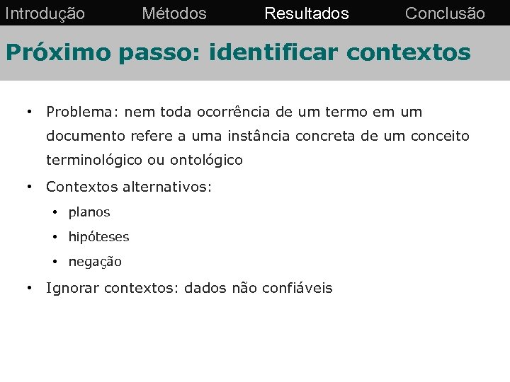 Introdução Métodos Resultados Conclusão Próximo passo: identificar contextos • Problema: nem toda ocorrência de um termo em um documento refere a uma instância concreta de um conceito terminológico ou ontológico • Contextos alternativos: • planos • hipóteses • negação • Ignorar contextos: dados não confiáveis