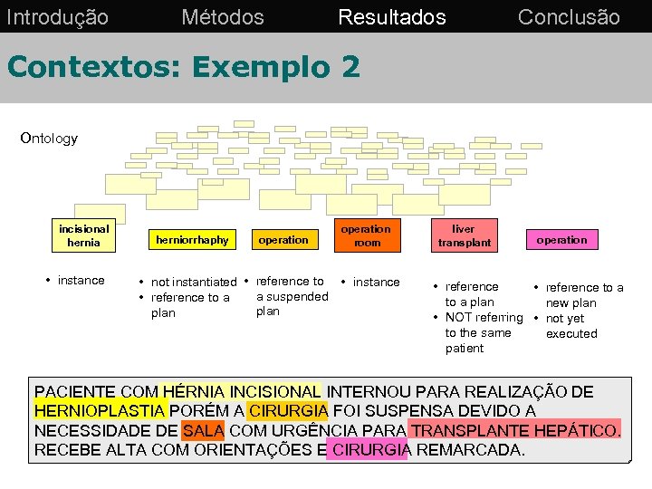 Introdução Métodos Resultados Conclusão Contextos: Exemplo 2 Ontology incisional hernia • instance herniorrhaphy operation room • not instantiated • reference to • instance a suspended • reference to a plan liver transplant operation • reference to a plan new plan • NOT referring • not yet to the same executed patient PACIENTE COM HÉRNIA INCISIONAL INTERNOU PARA REALIZAÇÃO DE HERNIOPLASTIA PORÉM A CIRURGIA FOI SUSPENSA DEVIDO A NECESSIDADE DE SALA COM URGÊNCIA PARA TRANSPLANTE HEPÁTICO. RECEBE ALTA COM ORIENTAÇÕES E CIRURGIA REMARCADA.
