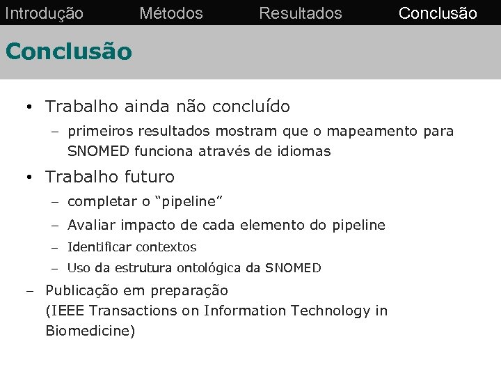 Introdução Métodos Resultados Conclusão • Trabalho ainda não concluído – primeiros resultados mostram que o mapeamento para SNOMED funciona através de idiomas • Trabalho futuro – completar o “pipeline” – Avaliar impacto de cada elemento do pipeline – Identificar contextos – Uso da estrutura ontológica da SNOMED – Publicação em preparação (IEEE Transactions on Information Technology in Biomedicine)