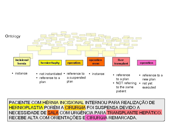 Ontology incisional hernia • instance herniorrhaphy operation room • not instantiated • reference to • instance a suspended • reference to a plan liver transplant operation • reference to a plan new plan • NOT referring • not yet to the same executed patient PACIENTE COM HÉRNIA INCISIONAL INTERNOU PARA REALIZAÇÃO DE HERNIOPLASTIA PORÉM A CIRURGIA FOI SUSPENSA DEVIDO A NECESSIDADE DE SALA COM URGÊNCIA PARA TRANSPLANTE HEPÁTICO. RECEBE ALTA COM ORIENTAÇÕES E CIRURGIA REMARCADA.