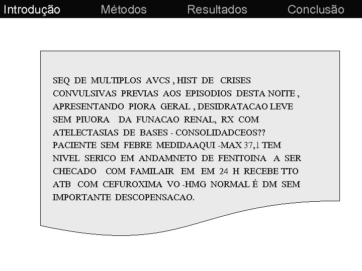 Introdução Métodos Resultados Conclusão SEQ DE MULTIPLOS AVCS , HIST DE CRISES CONVULSIVAS PREVIAS AOS EPISODIOS DESTA NOITE , APRESENTANDO PIORA GERAL , DESIDRATACAO LEVE SEM PIUORA DA FUNACAO RENAL, RX COM ATELECTASIAS DE BASES - CONSOLIDADCEOS? ? PACIENTE SEM FEBRE MEDIDAAQUI -MAX 37, 1 TEM NIVEL SERICO EM ANDAMNETO DE FENITOINA A SER CHECADO COM FAMILAIR EM EM 24 H RECEBE TTO ATB COM CEFUROXIMA VO -HMG NORMAL É DM SEM IMPORTANTE DESCOPENSACAO.