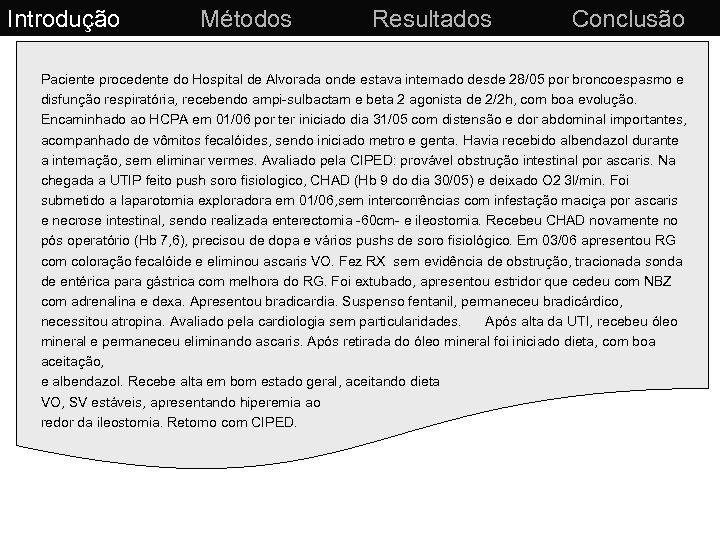 Introdução Métodos Resultados Conclusão Paciente procedente do Hospital de Alvorada onde estava internado desde 28/05 por broncoespasmo e disfunção respiratória, recebendo ampi-sulbactam e beta 2 agonista de 2/2 h, com boa evolução. Encaminhado ao HCPA em 01/06 por ter iniciado dia 31/05 com distensão e dor abdominal importantes, acompanhado de vômitos fecalóides, sendo iniciado metro e genta. Havia recebido albendazol durante a internação, sem eliminar vermes. Avaliado pela CIPED: provável obstrução intestinal por ascaris. Na chegada a UTIP feito push soro fisiologico, CHAD (Hb 9 do dia 30/05) e deixado O 2 3 l/min. Foi submetido a laparotomia exploradora em 01/06, sem intercorrências com infestação maciça por ascaris e necrose intestinal, sendo realizada enterectomia -60 cm- e ileostomia. Recebeu CHAD novamente no pós operatório (Hb 7, 6), precisou de dopa e vários pushs de soro fisiológico. Em 03/06 apresentou RG com coloração fecalóide e eliminou ascaris VO. Fez RX sem evidência de obstrução, tracionada sonda de entérica para gástrica com melhora do RG. Foi extubado, apresentou estridor que cedeu com NBZ com adrenalina e dexa. Apresentou bradicardia. Suspenso fentanil, permaneceu bradicárdico, necessitou atropina. Avaliado pela cardiologia sem particularidades. Após alta da UTI, recebeu óleo mineral e permaneceu eliminando ascaris. Após retirada do óleo mineral foi iniciado dieta, com boa aceitação, e albendazol. Recebe alta em bom estado geral, aceitando dieta VO, SV estáveis, apresentando hiperemia ao redor da ileostomia. Retorno com CIPED.