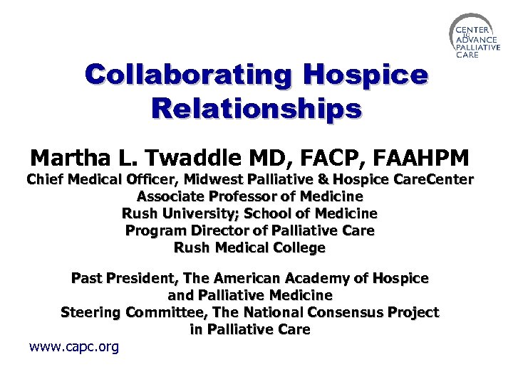 Collaborating Hospice Relationships Martha L. Twaddle MD, FACP, FAAHPM Chief Medical Officer, Midwest Palliative & Hospice Care. Center Associate Professor of Medicine Rush University; School of Medicine Program Director of Palliative Care Rush Medical College Past President, The American Academy of Hospice and Palliative Medicine Steering Committee, The National Consensus Project in Palliative Care www. capc. org