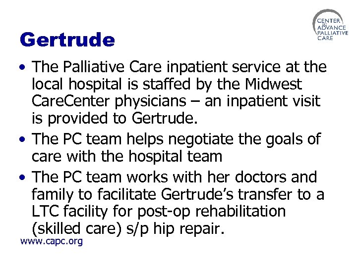 Gertrude • The Palliative Care inpatient service at the local hospital is staffed by the Midwest Care. Center physicians – an inpatient visit is provided to Gertrude. • The PC team helps negotiate the goals of care with the hospital team • The PC team works with her doctors and family to facilitate Gertrude’s transfer to a LTC facility for post-op rehabilitation (skilled care) s/p hip repair. www. capc. org