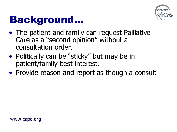 Background… • The patient and family can request Palliative Care as a “second opinion” without a consultation order. • Politically can be “sticky” but may be in patient/family best interest. • Provide reason and report as though a consult www. capc. org