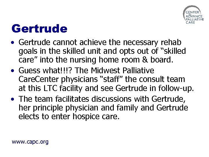 Gertrude • Gertrude cannot achieve the necessary rehab goals in the skilled unit and opts out of “skilled care” into the nursing home room & board. • Guess what!!!? The Midwest Palliative Care. Center physicians “staff” the consult team at this LTC facility and see Gertrude in follow-up. • The team facilitates discussions with Gertrude, her principle physician and family and Gertrude elects to enter hospice care. www. capc. org