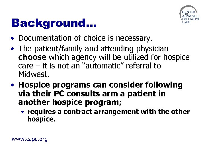 Background… • Documentation of choice is necessary. • The patient/family and attending physician choose which agency will be utilized for hospice care – it is not an “automatic” referral to Midwest. • Hospice programs can consider following via their PC consults arm a patient in another hospice program; • requires a contract arrangement with the other hospice. www. capc. org