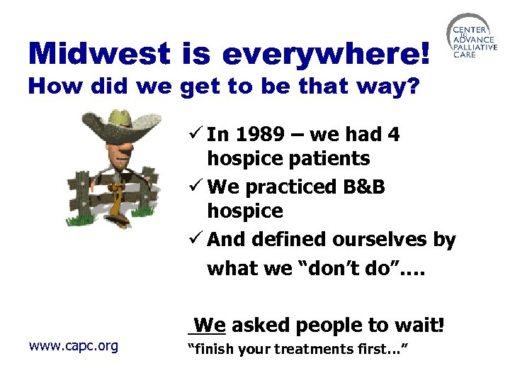 Midwest is everywhere! How did we get to be that way? ü In 1989 – we had 4 hospice patients ü We practiced B&B hospice ü And defined ourselves by what we “don’t do”…. www. capc. org We asked people to wait! “finish your treatments first…”
