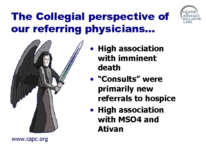 The Collegial perspective of our referring physicians… • High association with imminent death • “Consults” were primarily new referrals to hospice • High association with MSO 4 and Ativan www. capc. org