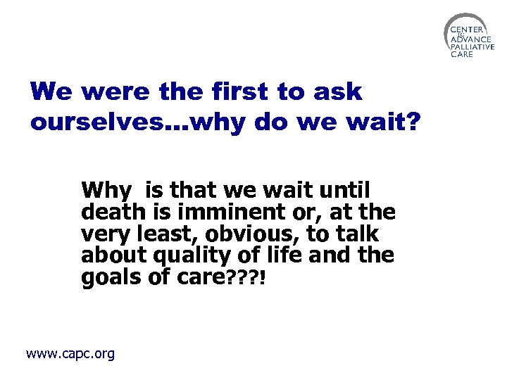 We were the first to ask ourselves…why do we wait? Why is that we wait until death is imminent or, at the very least, obvious, to talk about quality of life and the goals of care? ? ? ! www. capc. org