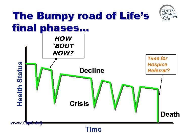 The Bumpy road of Life’s final phases… Health Status HOW ‘BOUT NOW? Decline Time for Hospice Referral? Crisis Death www. capc. org Time