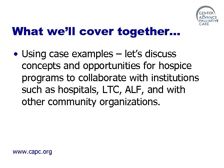 What we’ll cover together… • Using case examples – let’s discuss concepts and opportunities for hospice programs to collaborate with institutions such as hospitals, LTC, ALF, and with other community organizations. www. capc. org