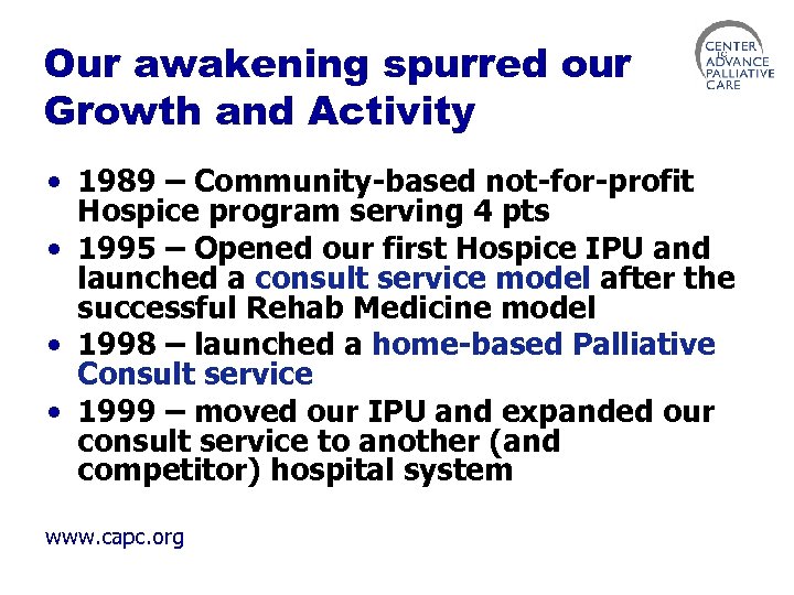 Our awakening spurred our Growth and Activity • 1989 – Community-based not-for-profit Hospice program serving 4 pts • 1995 – Opened our first Hospice IPU and launched a consult service model after the successful Rehab Medicine model • 1998 – launched a home-based Palliative Consult service • 1999 – moved our IPU and expanded our consult service to another (and competitor) hospital system www. capc. org