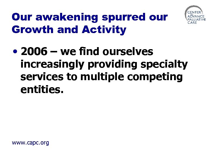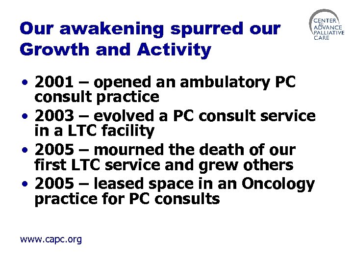 Our awakening spurred our Growth and Activity • 2001 – opened an ambulatory PC consult practice • 2003 – evolved a PC consult service in a LTC facility • 2005 – mourned the death of our first LTC service and grew others • 2005 – leased space in an Oncology practice for PC consults www. capc. org