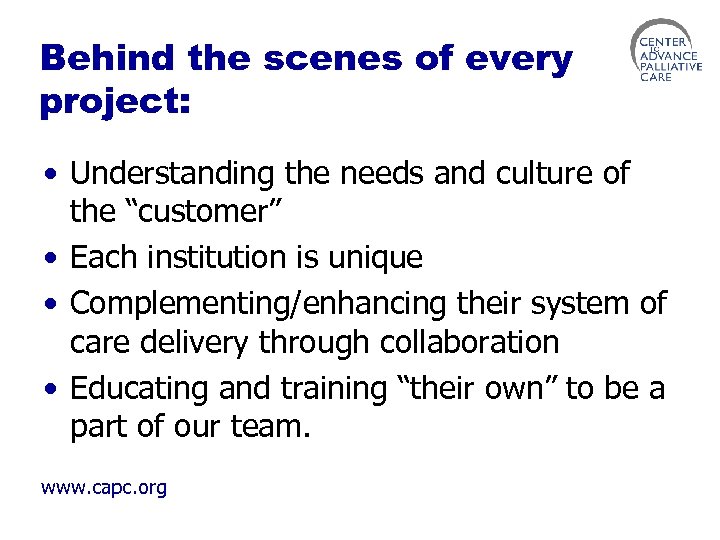 Behind the scenes of every project: • Understanding the needs and culture of the “customer” • Each institution is unique • Complementing/enhancing their system of care delivery through collaboration • Educating and training “their own” to be a part of our team. www. capc. org