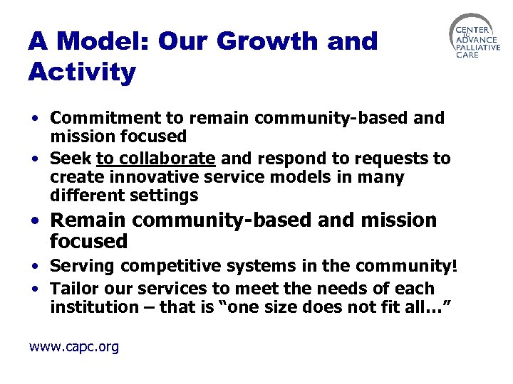 A Model: Our Growth and Activity • Commitment to remain community-based and mission focused • Seek to collaborate and respond to requests to create innovative service models in many different settings • Remain community-based and mission focused • Serving competitive systems in the community! • Tailor our services to meet the needs of each institution – that is “one size does not fit all…” www. capc. org