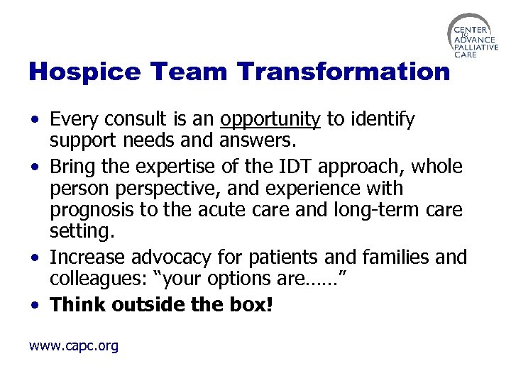 Hospice Team Transformation • Every consult is an opportunity to identify support needs and answers. • Bring the expertise of the IDT approach, whole person perspective, and experience with prognosis to the acute care and long-term care setting. • Increase advocacy for patients and families and colleagues: “your options are……” • Think outside the box! www. capc. org