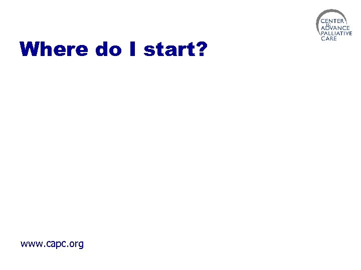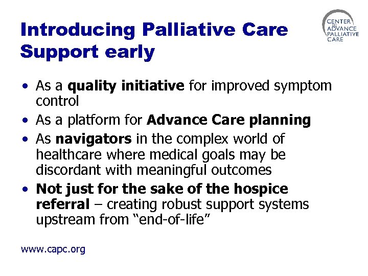 Introducing Palliative Care Support early • As a quality initiative for improved symptom control • As a platform for Advance Care planning • As navigators in the complex world of healthcare where medical goals may be discordant with meaningful outcomes • Not just for the sake of the hospice referral – creating robust support systems upstream from “end-of-life” www. capc. org