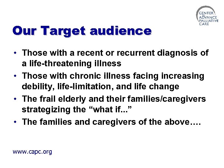 Our Target audience • Those with a recent or recurrent diagnosis of a life-threatening illness • Those with chronic illness facing increasing debility, life-limitation, and life change • The frail elderly and their families/caregivers strategizing the “what if. . . ” • The families and caregivers of the above…. www. capc. org