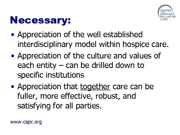 Necessary: • Appreciation of the well established interdisciplinary model within hospice care. • Appreciation of the culture and values of each entity – can be drilled down to specific institutions • Appreciation that together care can be fuller, more effective, robust, and satisfying for all parties. www. capc. org