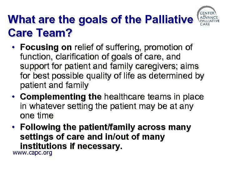 What are the goals of the Palliative Care Team? • Focusing on relief of suffering, promotion of function, clarification of goals of care, and support for patient and family caregivers; aims for best possible quality of life as determined by patient and family • Complementing the healthcare teams in place in whatever setting the patient may be at any one time • Following the patient/family across many settings of care and in/out of many institutions if necessary. www. capc. org