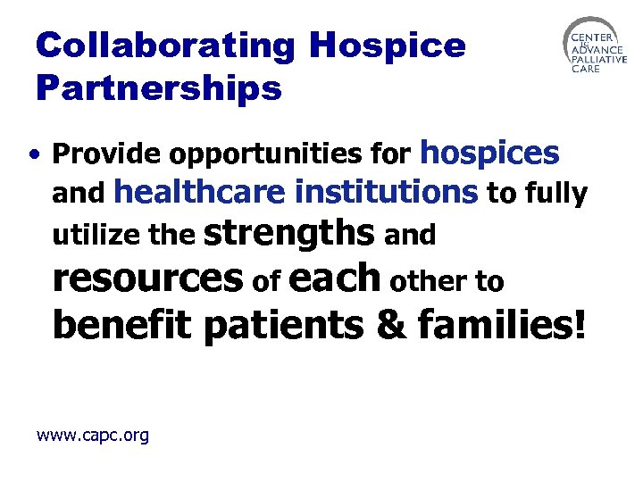 Collaborating Hospice Partnerships • Provide opportunities for hospices and healthcare institutions to fully utilize the strengths and resources of each other to benefit patients & families! www. capc. org